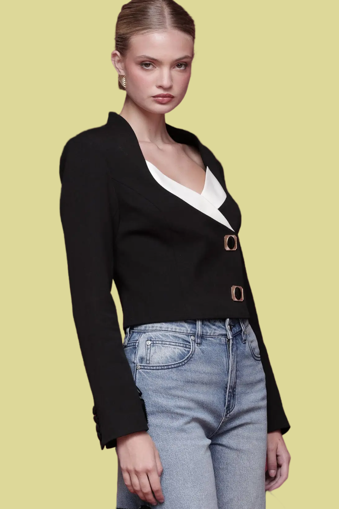 cropped blazer with sharp structure and playful contrast