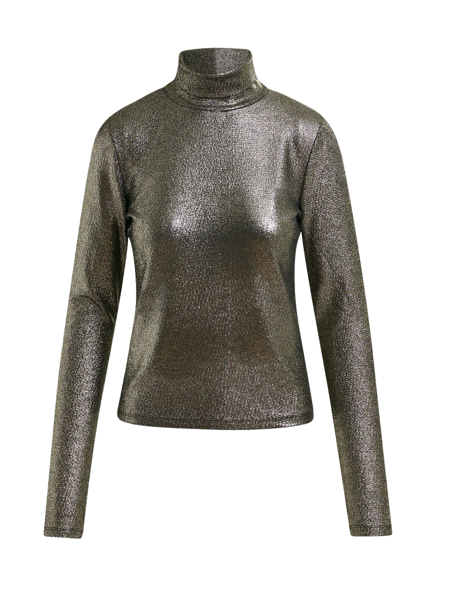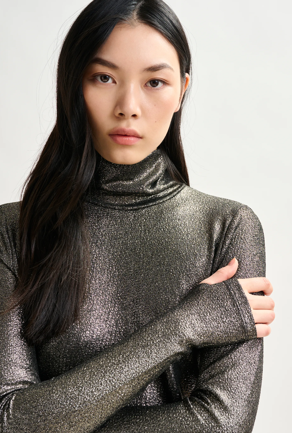 Long-sleeved turtleneck top features a sleek, fitted silhouette crafted from stretch-jersey fabric and finished with an all-over metallic silver shimmer. The fine silver flecks catch the light for a bold, glistening effect that adds a modern, statement-making edge.