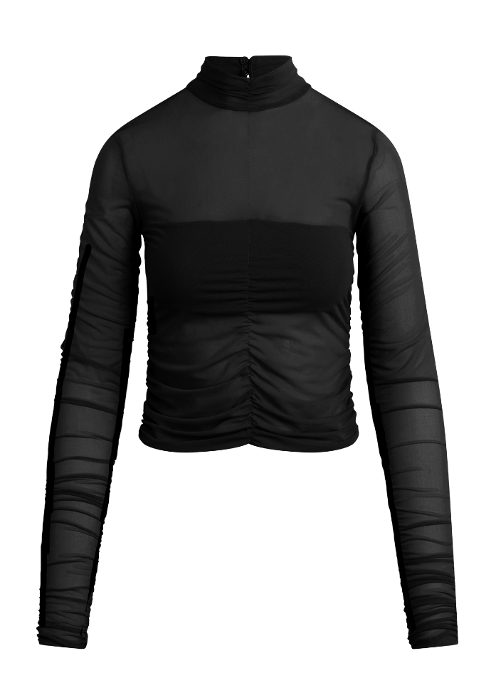 A mesh top that fits close with front ruching, a mock neckline and long sleeves.