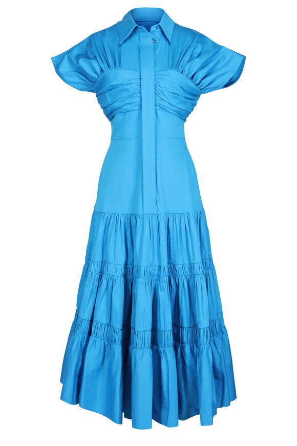 The Carosini Dress is a short sleeve tiered midi dress with shirring along the bust and a structured shirt collar.