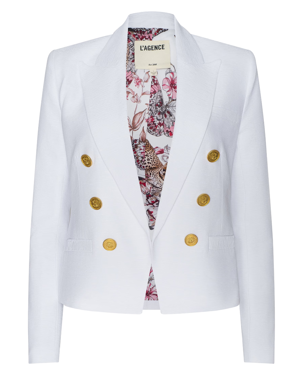 bestselling open-front Brooke features a flattering, tapered fit. Crafted from a lightweight ribbed ottoman fabric featuring a cool, slick hand and subtle luster, this sharp, double-breasted blazer is now back in white.