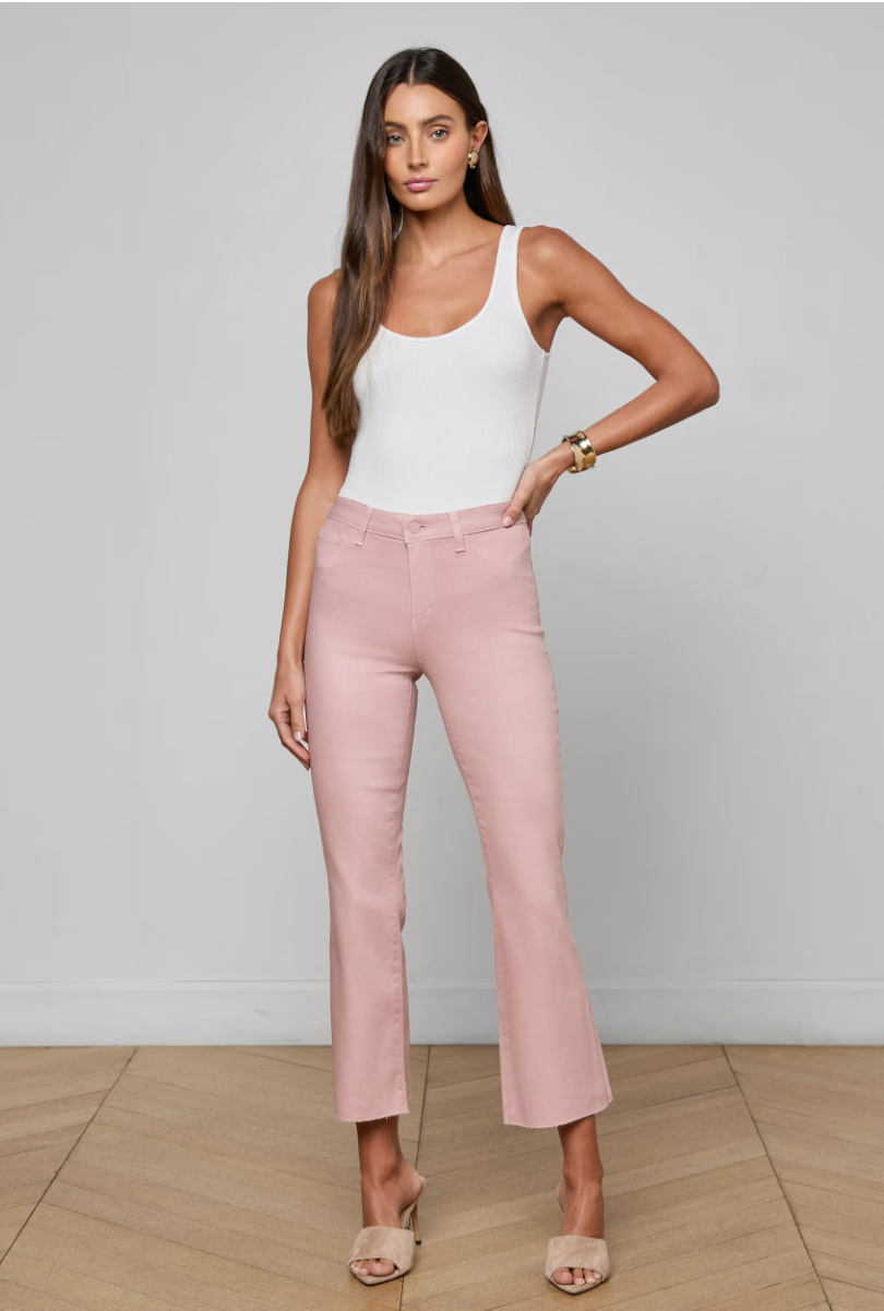 L'agence Kendra Crop Flare in coated pale rose• Super stretch coated denim• Faux front pockets• Functional back pockets• Zip fly and button closure