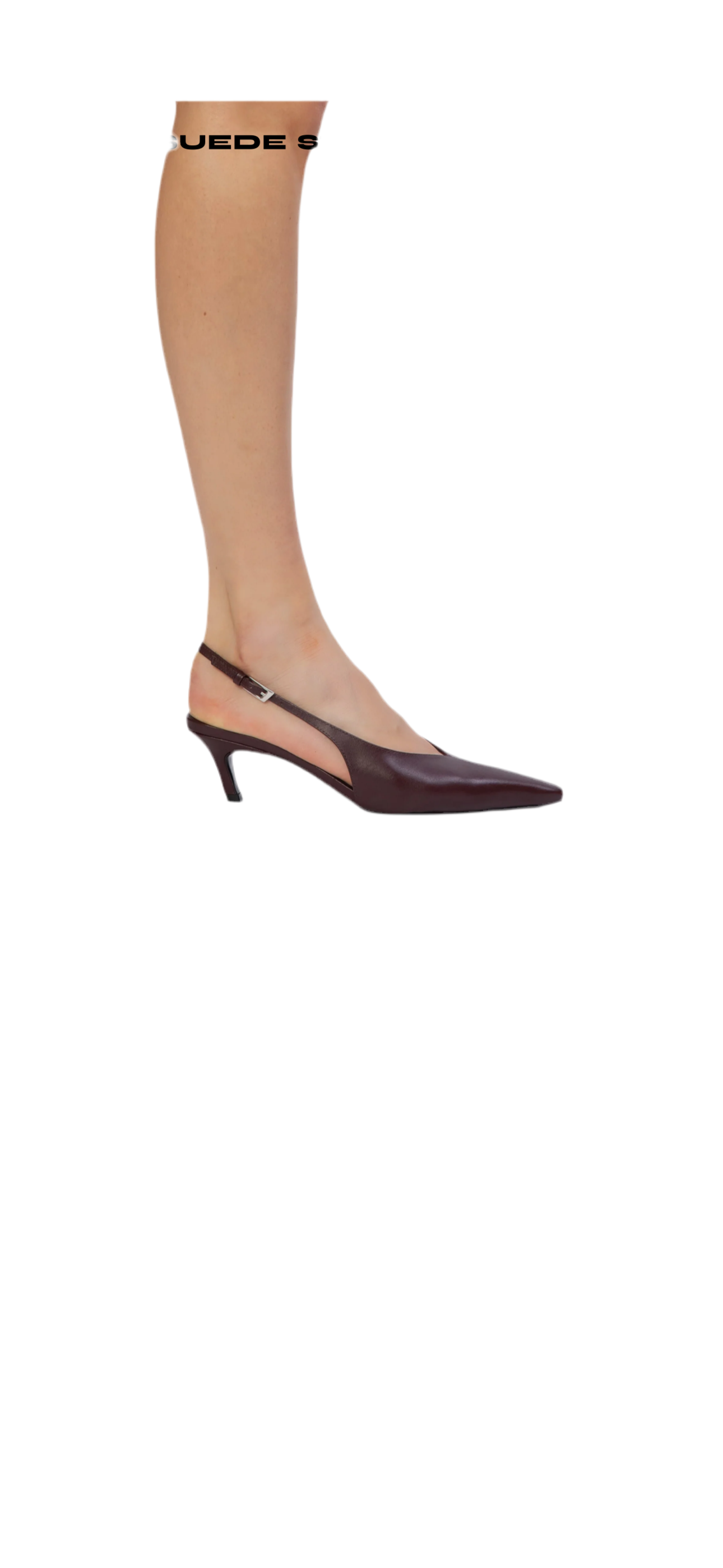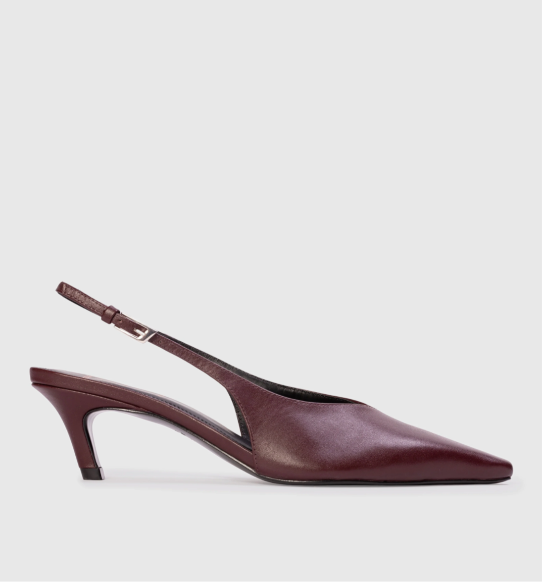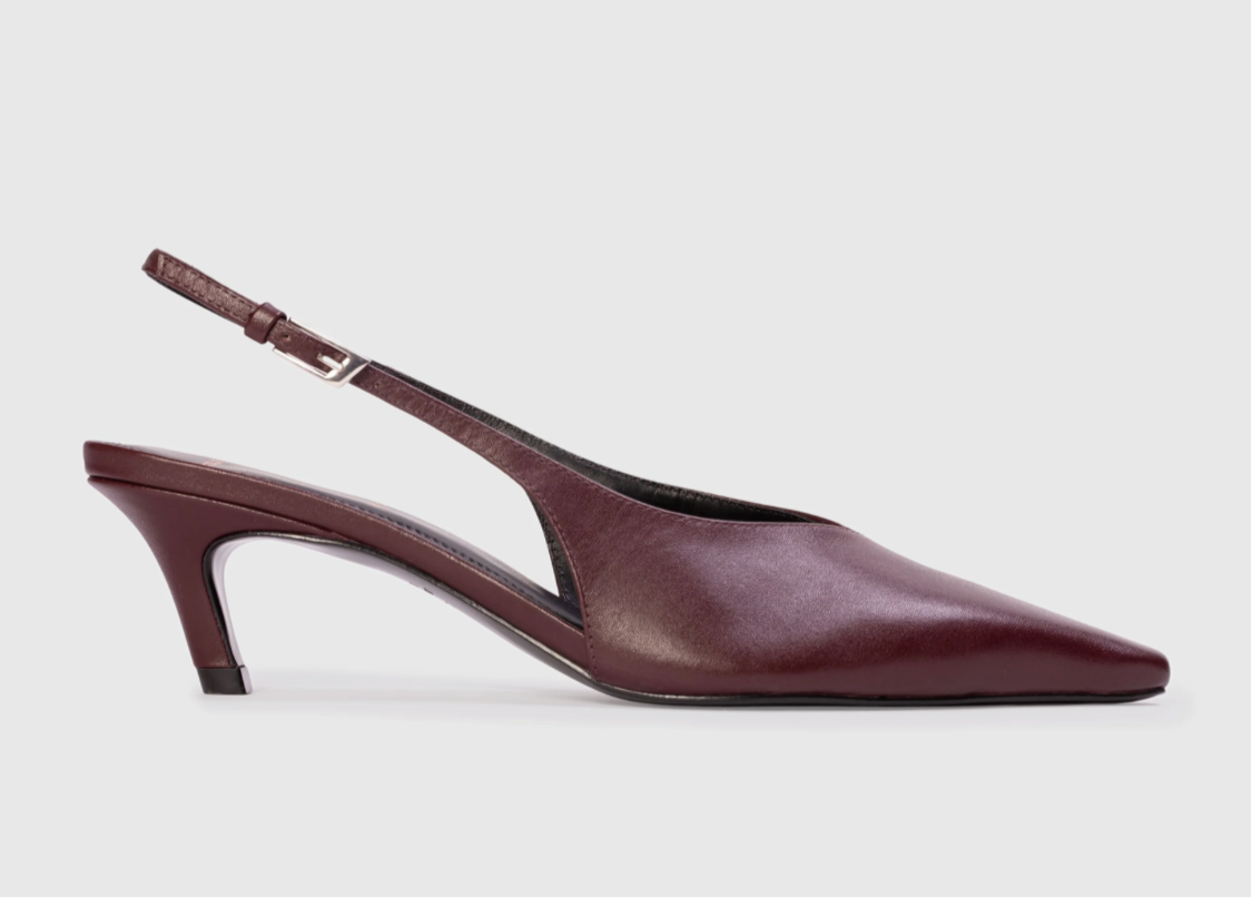 Snipped toe slingback pump, set on an angled kitten heel. Made with smooth buffed leather.