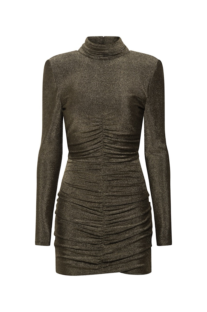 Bronzy metallic mini with shoulder pads, all-over ruching, and a draped open back