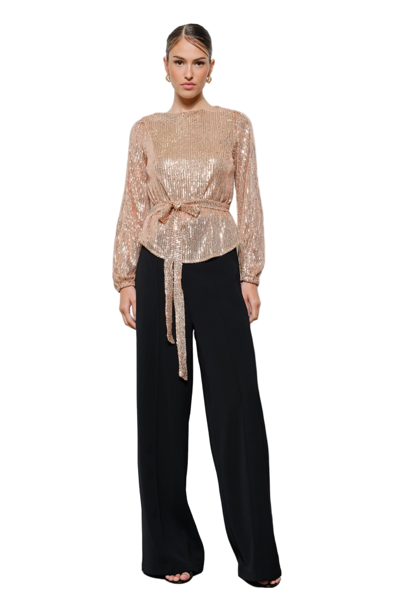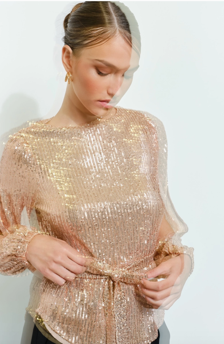 All-over sequin design adds festive sparkle and texture -Long sleeves with dramatic slit openings for a touch of glam -Matching self-tie belt enhances the waistline -Keyhole closure at back neck for easy wear