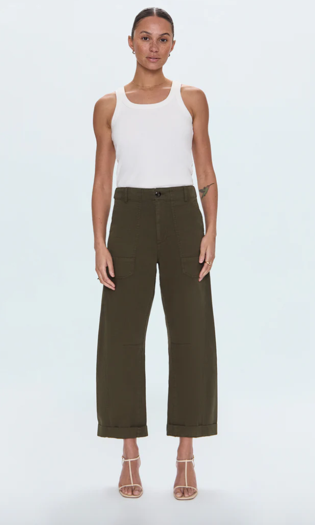 A utilitarian-inspired silhouette, Tori features our signature bowed leg, functional details, and a cropped 26 ½" inseam that hits at the ankle. Crafted from 100% cotton for structure and comfort, Sequoia brings understated sophistication in a deep olive tone that transitions effortlessly from day to night.