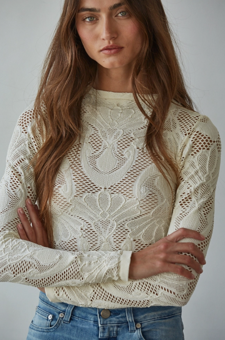 This knit jacquard top features a see-through fishnet overlay, crafted from a 92% nylon and 8% spandex blend. The material is a stretchy knit that offers comfort and flexibility, making it perfect for layering or a stand-alone statement piece. The intricate jacquard pattern adds texture and visual interest, while the mock neck and long sleeves provide a sophisticated look.