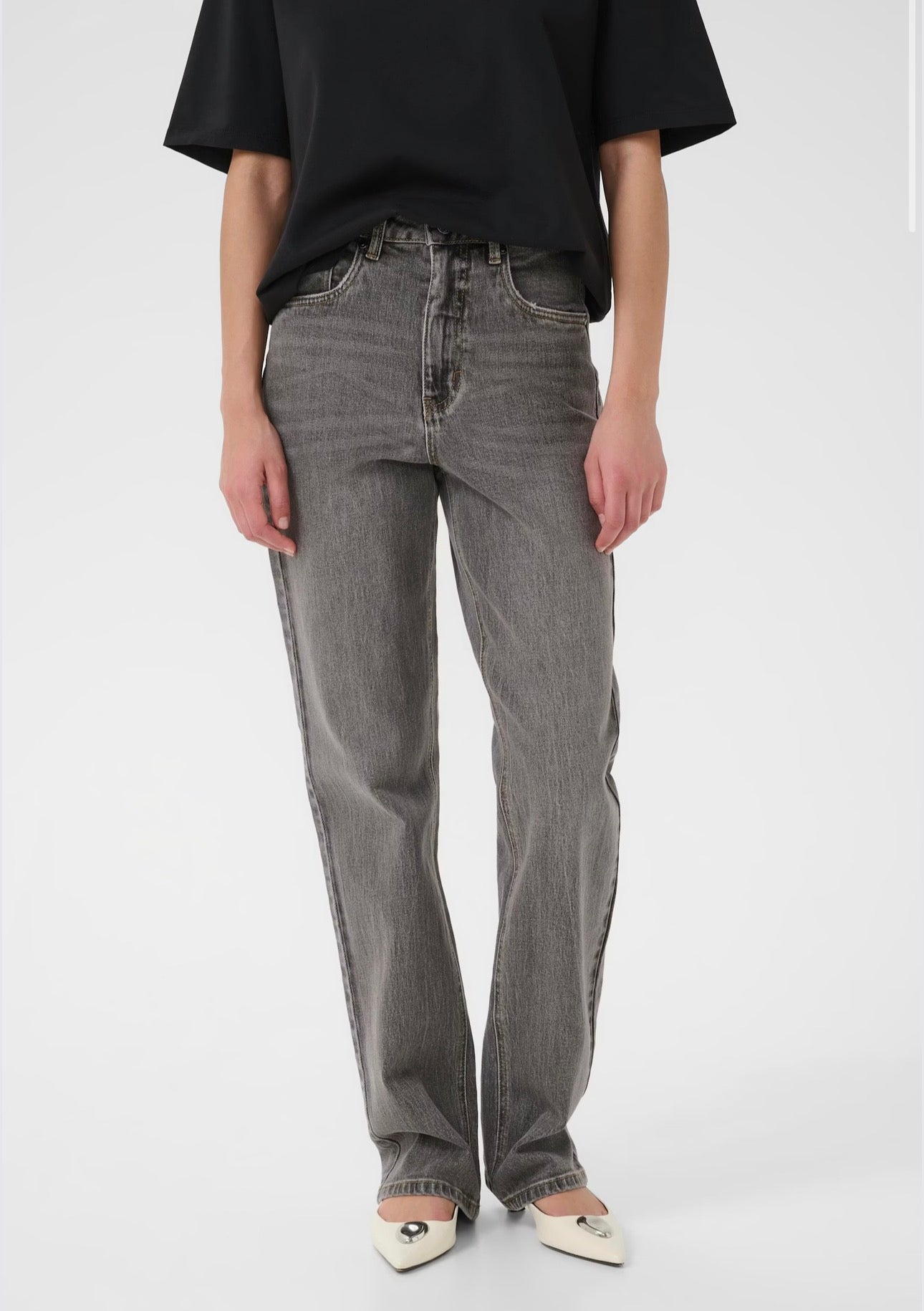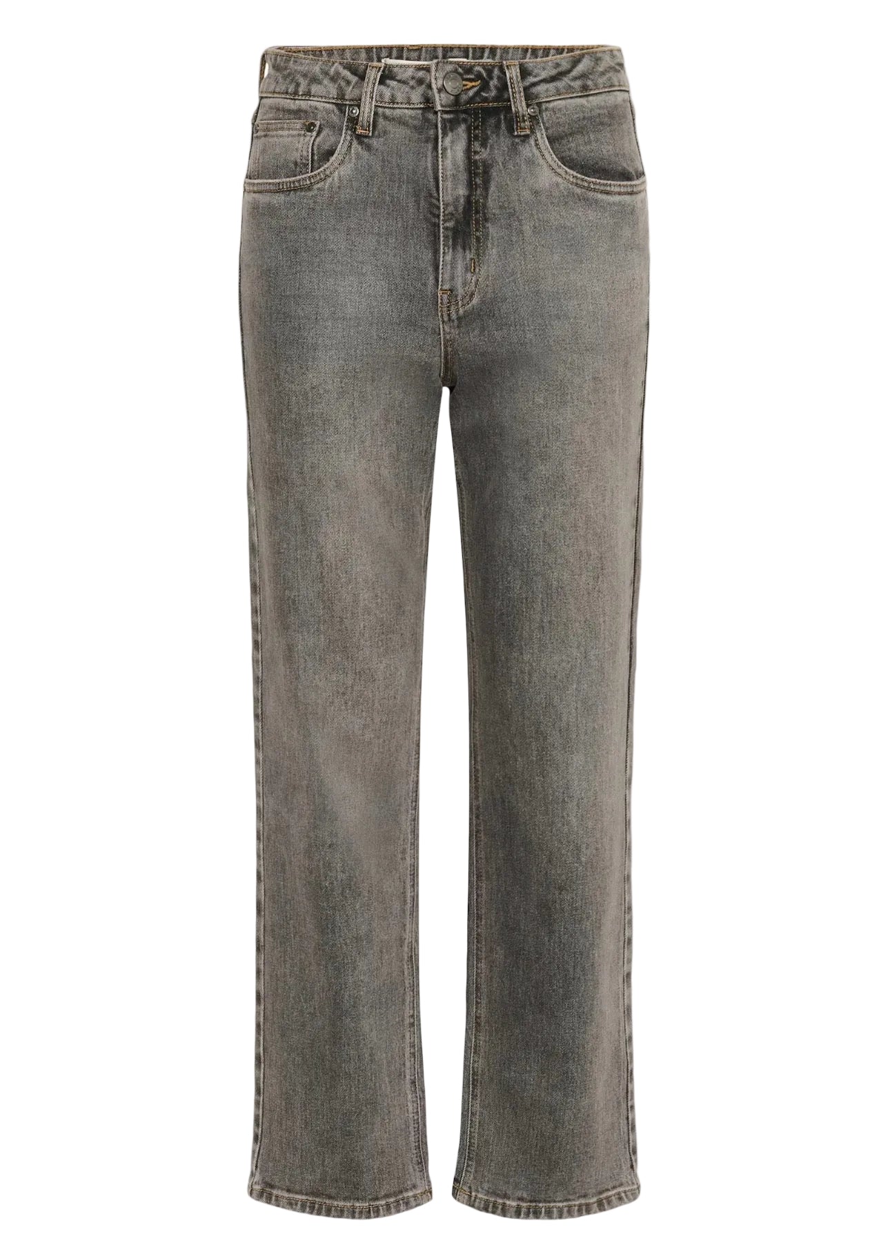 Straight leg jeans feature a high-rise waist, classic five-pocket styling and a zip fly with button closure.