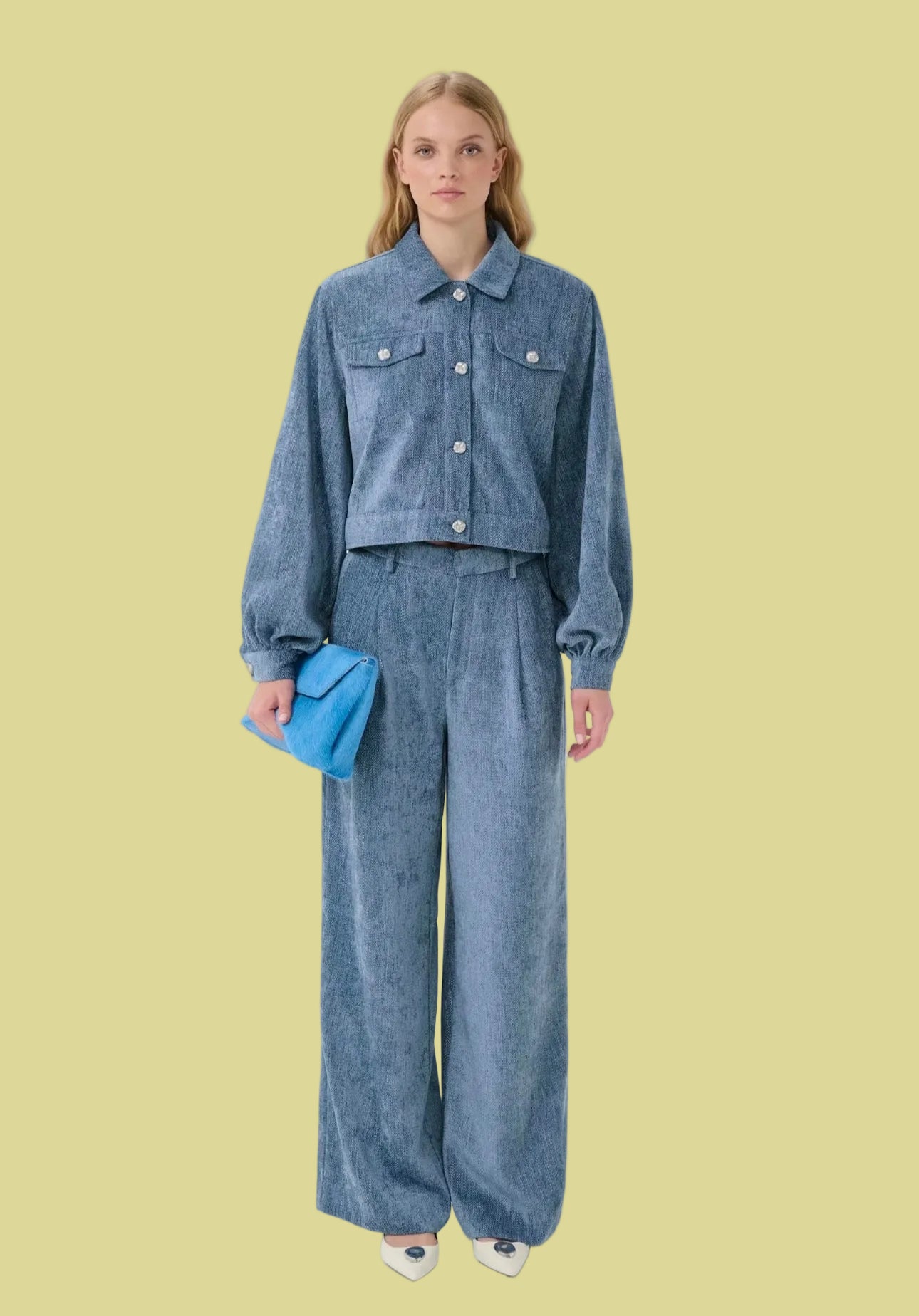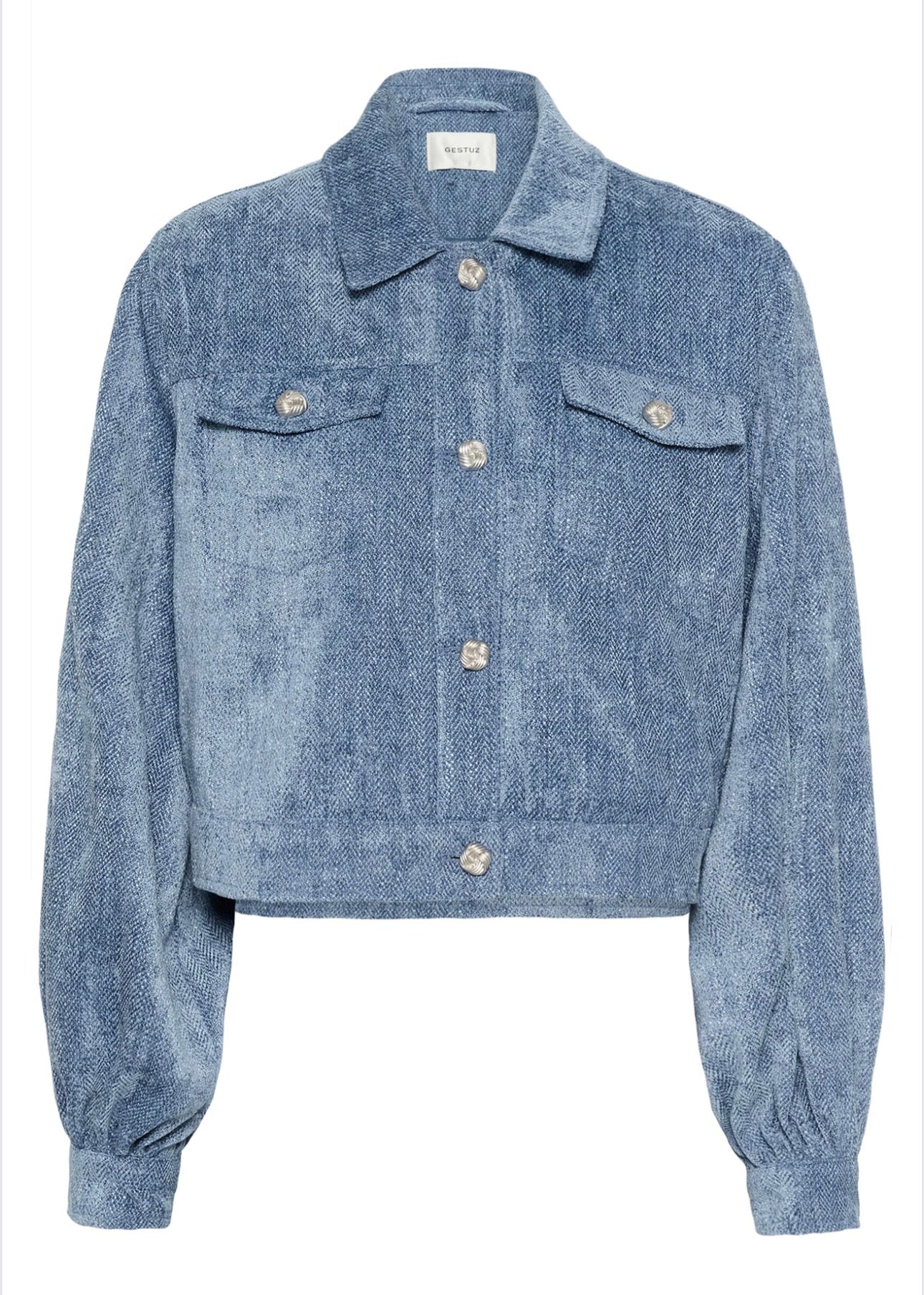 Cropped jacket with straight silhouette, structured collar, and full-length sleeves. Features button front, chest pockets with flaps, and lightly textured finish for modern style.
